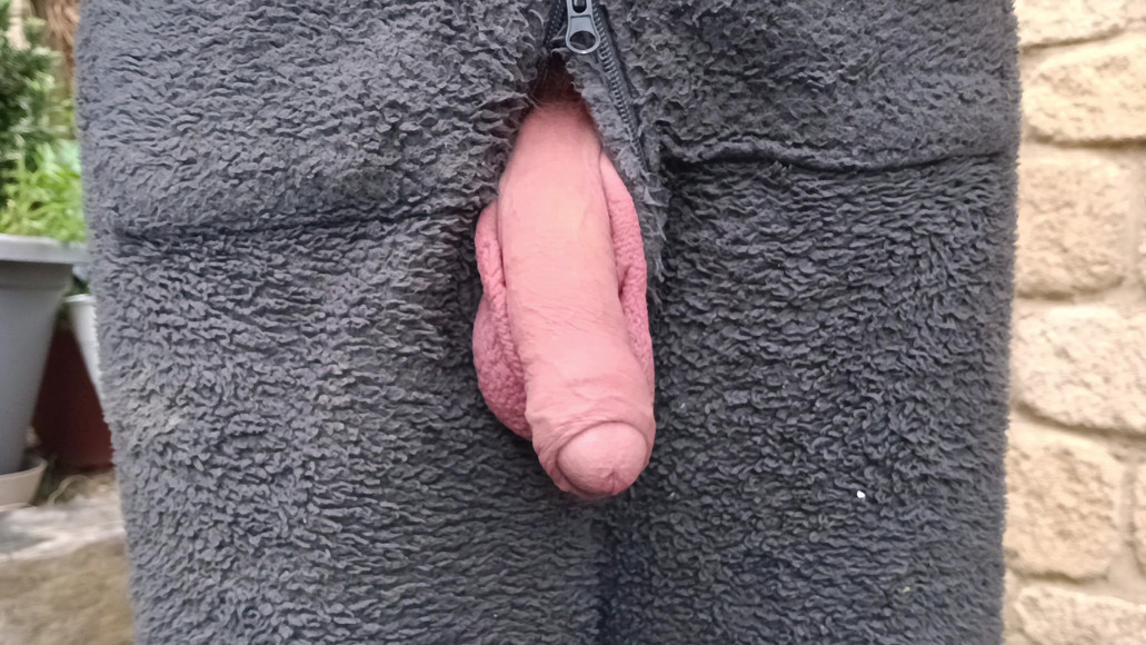 In the back garden wearing the onesie, getting my cock out and wanking off again. I get it out where the neighbours can see. Wanking slowly, letting it grow and get nice and hard then steadily stroking, rolling the foreskin back and forth, taking it right to the edge, dripping cum and eating it, close up creamy load.