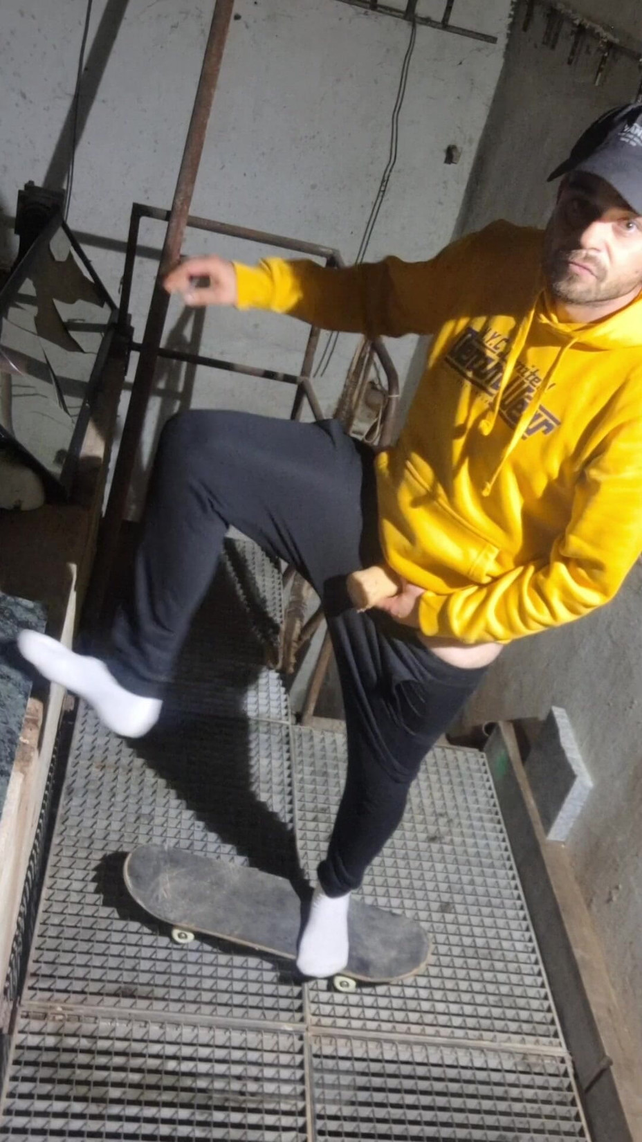 in a yellow sweatshirt, black sweatpants, white socks and VANS sneakers and with a skateboard. The compilation is with videos made in one night.