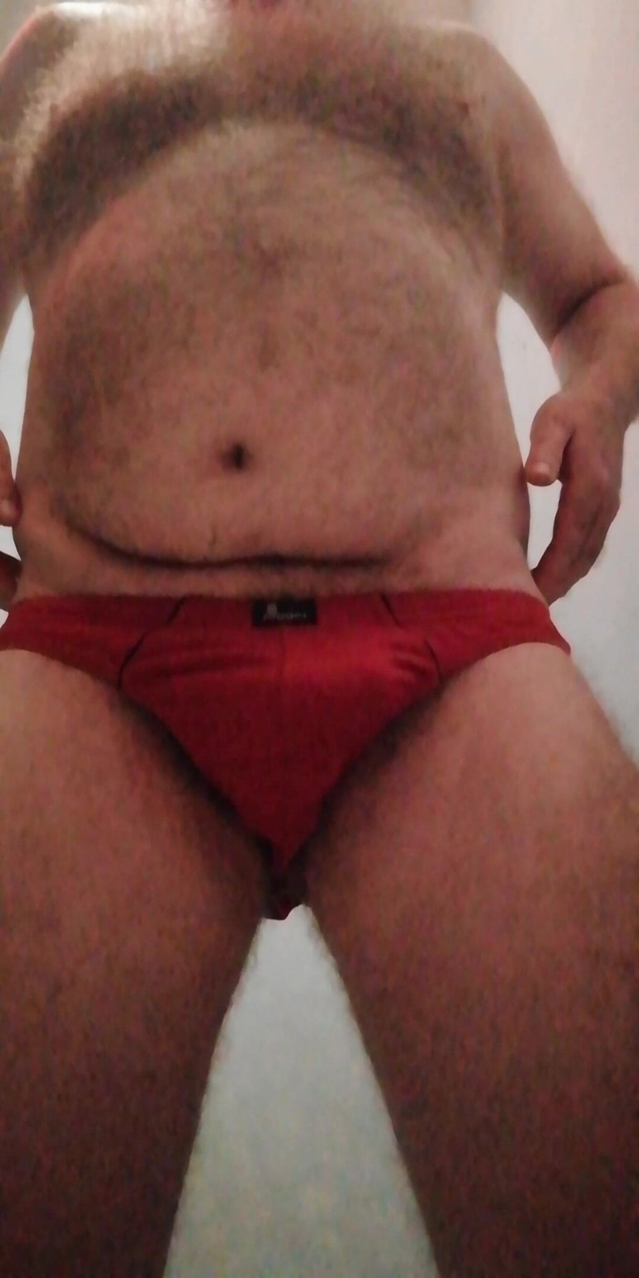 Ich streichle meine beule in enge rote vater-slips, wichse, bis ich eine riesige sahnige ladung bläst. Ich zeige meinen großen haarigen bauch und meine brust.