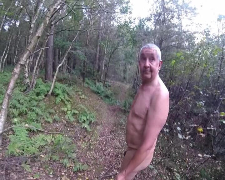 Fully naked walk in the woods walk to the picnic table for some fun.