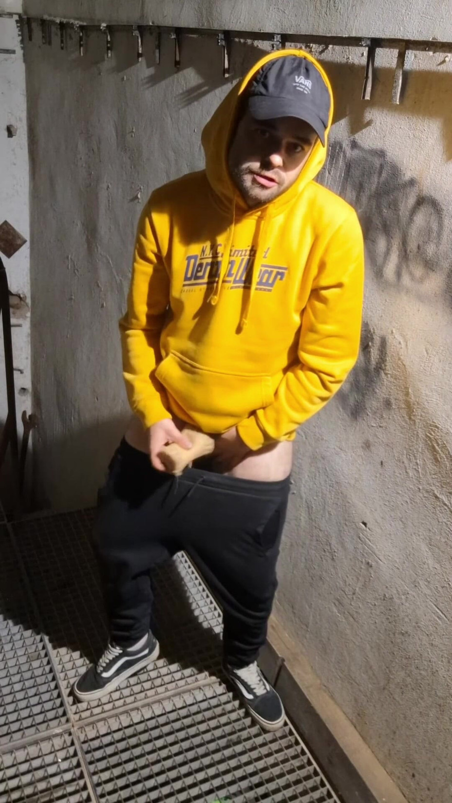 in a yellow sweatshirt, black sweatpants, white socks and VANS sneakers and with a skateboard. The compilation is with videos made in one night.