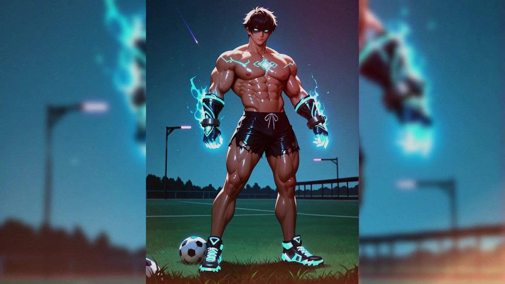 Ai generated images of muslce men on the soccer pitch posing shirtless.