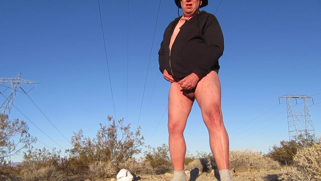 On a chilly desert day Swiney decided he needed to take a leak and shoot some cum just off of Ivanpah road... Nice views of his cock half-hard as he takes a whiz before he swells up and squirts another impressive load of cum out his heavy balls.