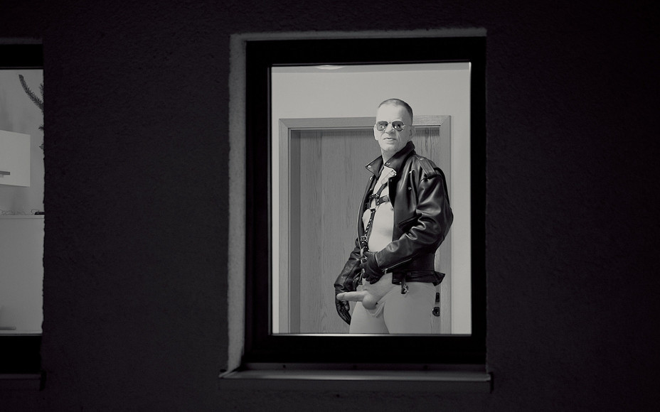 Leather Hunk is showing off in spandex thights and Leather Gloves near the window. You can watch his Bulge-, Nipple- and Cock Play from an opposite Window. Watch his enormous Bulge. At the end you will be rewarded with TWO XL GERMAN CUM SHOTS.