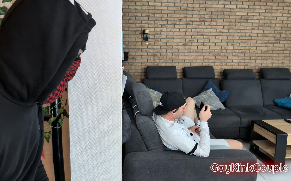 A stranger has been looking for the hot guy from the gym for a while. One evening he waits for him at his house to overpower him. The hot guy is wearing headphones and doesn't notice that the stranger is following him into his house. As he is jerking off on the couch, he is overpowered by the stranger and used rough and hard.