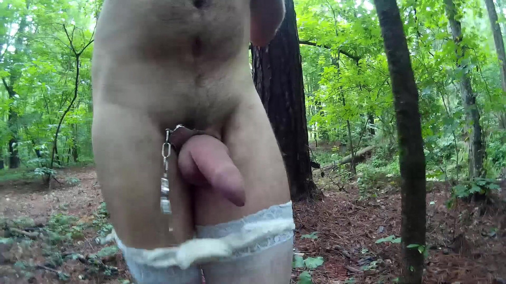 Jon Scarecrow plays with his uncut handcuffed cock while walking around exposed in the woods. He stole these stockings and thong from his ex-wife. Watch the cum fly after he climaxes in the end